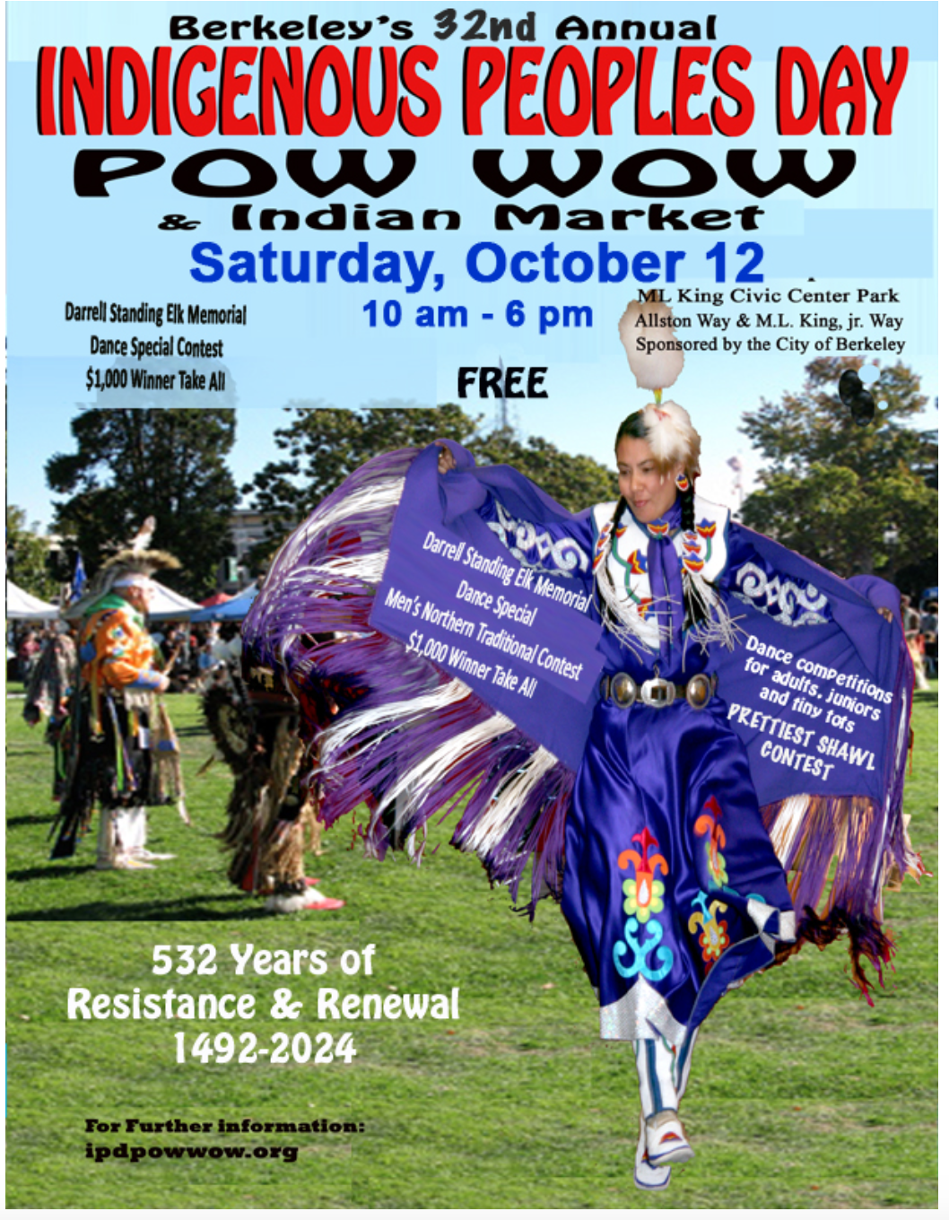City of Berkeley’s POW WOW and Indian Market, Native American food, art and dance, MLK Civic Center Park, Saturday, 10/12, 10 am-6 pm—FREE